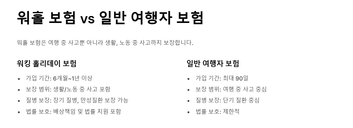 | 항목 | 워킹 홀리데이 보험 | 일반 여행자 보험 |