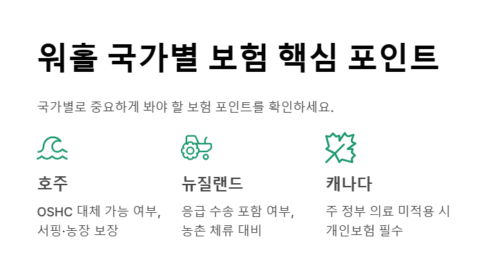 | 호주 | OSHC 대체 가능 보험 여부 확인 필요, 서핑·농장 일자리 보장 포함 중요 |