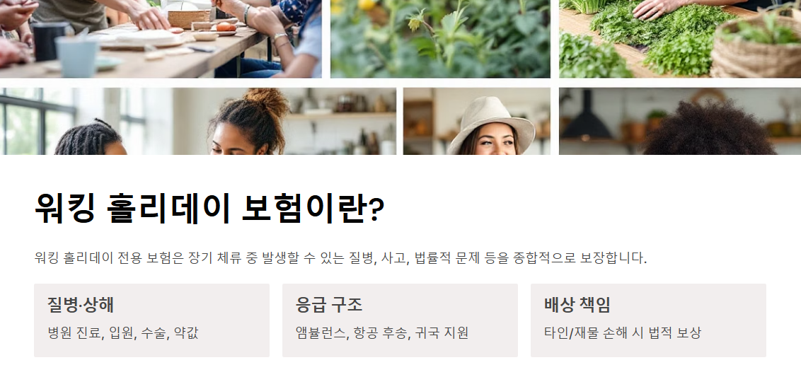 워킹 홀리데이 보험은 장기 체류 중 발생할 수 있는 질병, 사고, 응급치료, 법률적 문제를 보장하는 전용 보험입니다.