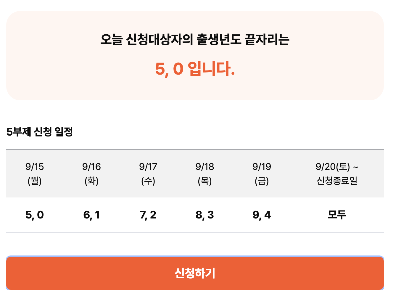 첫 주에는 신청이 몰릴 것을 대비해서 출생연도 끝자리에 따른 5부제가 운영되고 있어요.