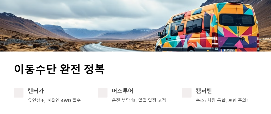 이동 수단 — 렌터카 vs 버스 투어 vs 캠퍼밴