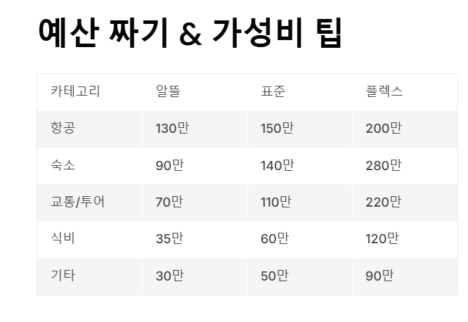 | 숙소 | 90 만 원(게스트하우스) | 140 만 원(호텔) | 280 만 원(프리미엄 빌라) |