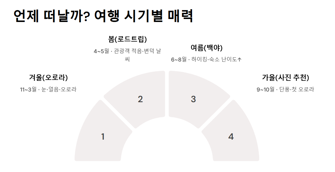 | 겨울(11 ~ 3월) | 오로라 시즌·눈 덮인 풍경 | 폭풍·도로 통제 빈발 | 오로라 헌팅, 얼음동굴 |
