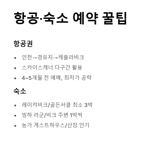 TIP : 아이슬란드 숙소는 취소 무료 옵션으로 잡고, 렌터카 일정이 확정되는 D‑60일 전 후에 최종 결정.