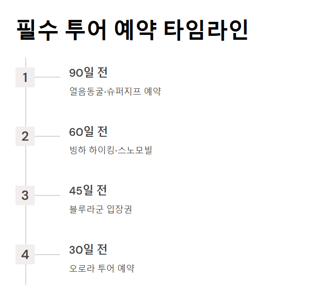 | 90 일 | 얼음동굴·고원 슈퍼지프 투어 | 하루 10–20 명 제한, 성수기 매진 속도 |