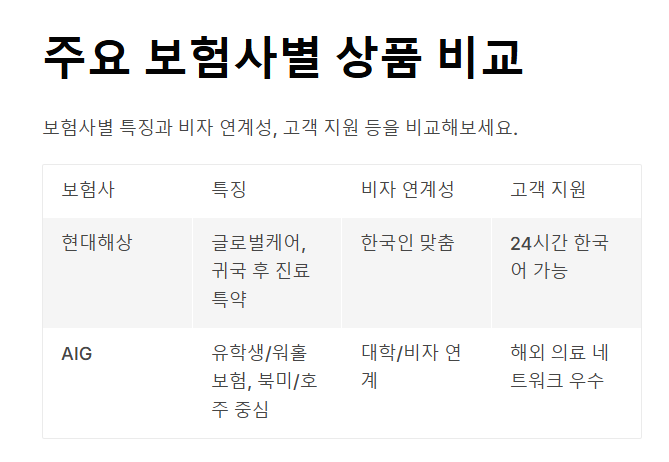 | AIG 유학생/워홀 보험 | 북미, 호주 체류자 중심 상품 | 대학/비자 연계 있음 | 해외 의료 네트워크 우수 |