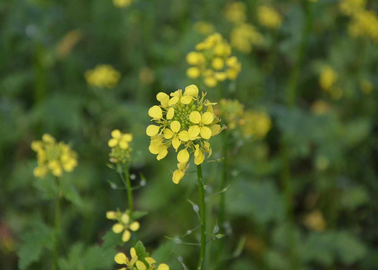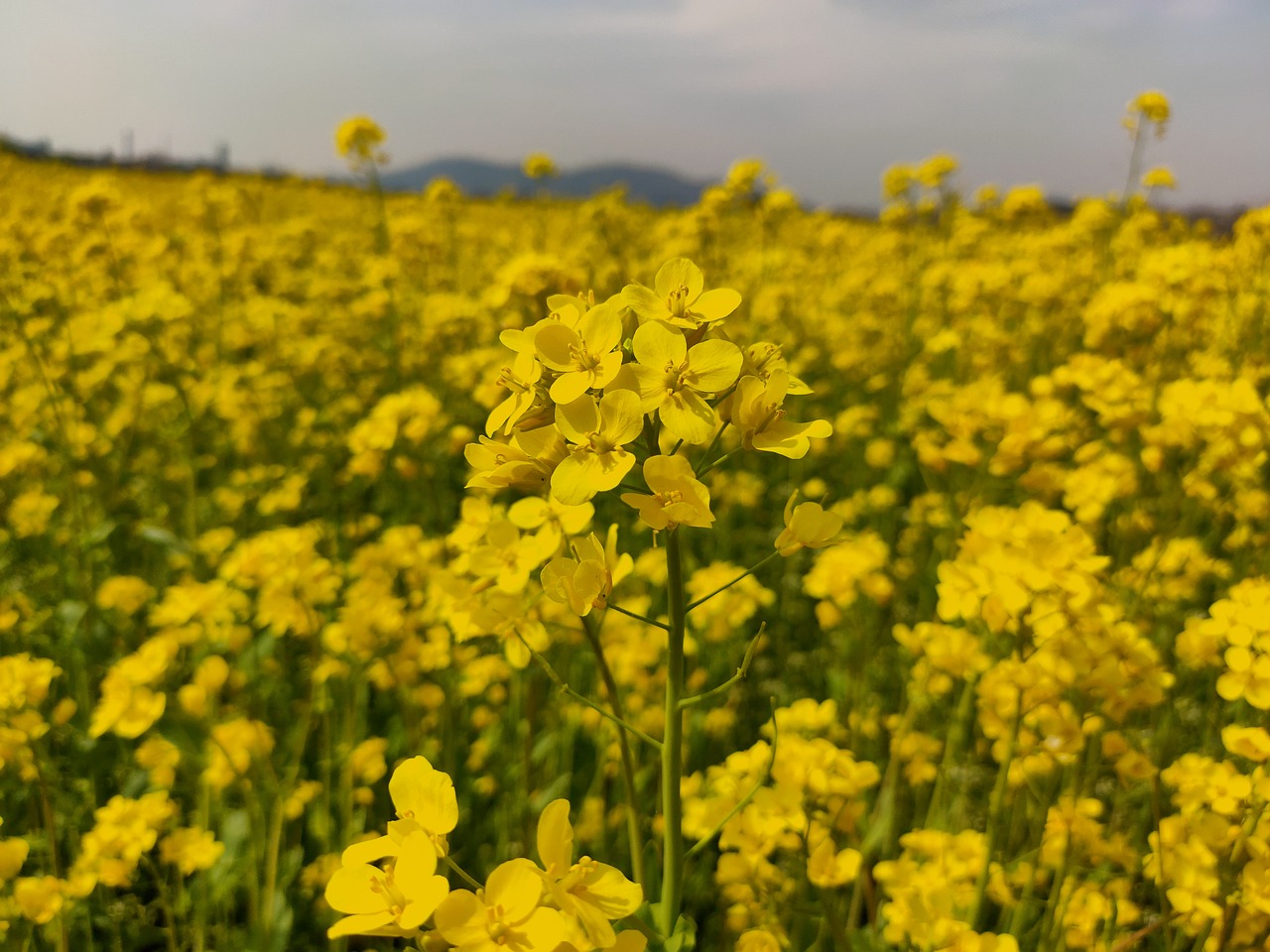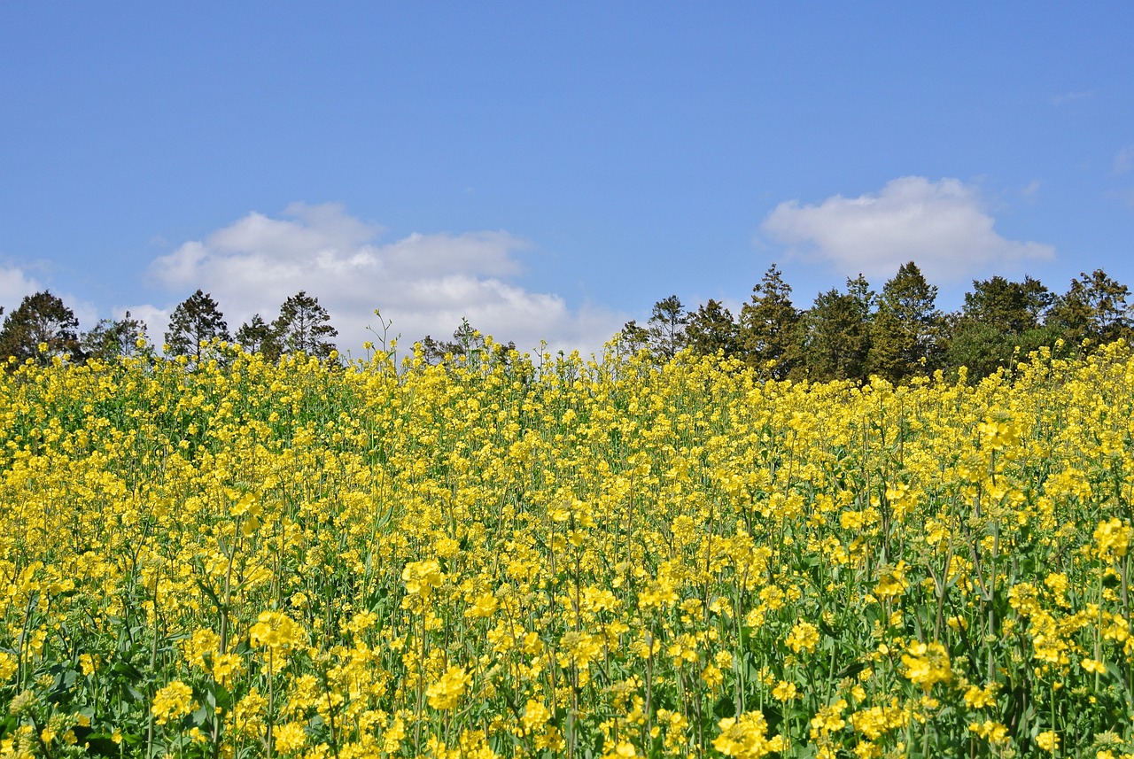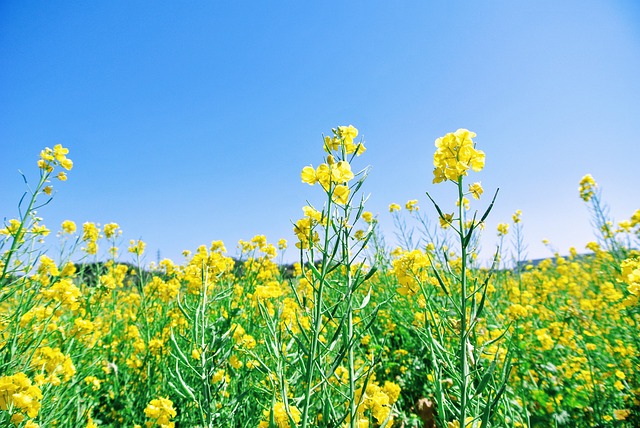 날씨가 맑은 날, 파란 하늘과 노란 유채꽃이 어우러진 풍경은 아름다운 사진을 담기에 최적입니다.