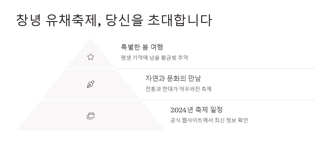 이 축제는 창녕 지역의 아름다운 자연경관과 지역 문화를 결합하여 많은 이들에게 사랑받고 있습니다.