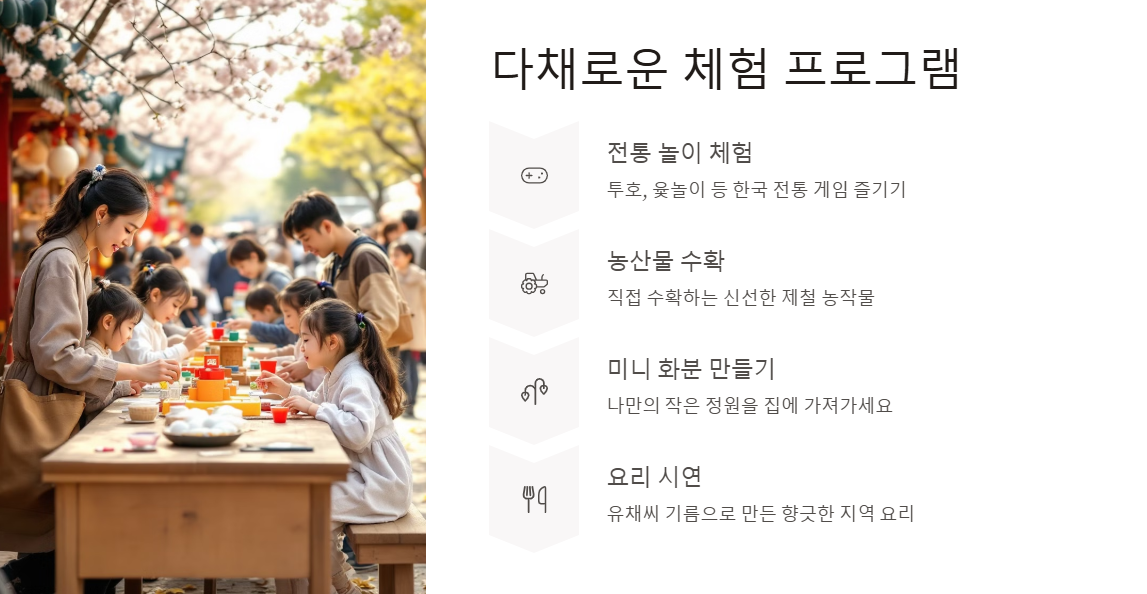 • 오후: 농촌 체험 부스 참여(전통 놀이, 공예 체험 등), 공연·버스킹 관람 후 기념품 구입