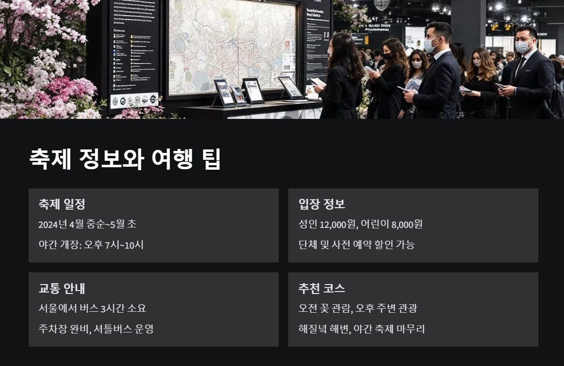 - 대중교통 & 셔틀 이용: 주차비나 유류비가 부담된다면, 남부터미널 직행버스와 축제장 셔틀버스를 활용하세요. 축제 공지사항을 확인해 셔틀버스 운행 시간과 노선을 미리 파악하면 편리합니다.