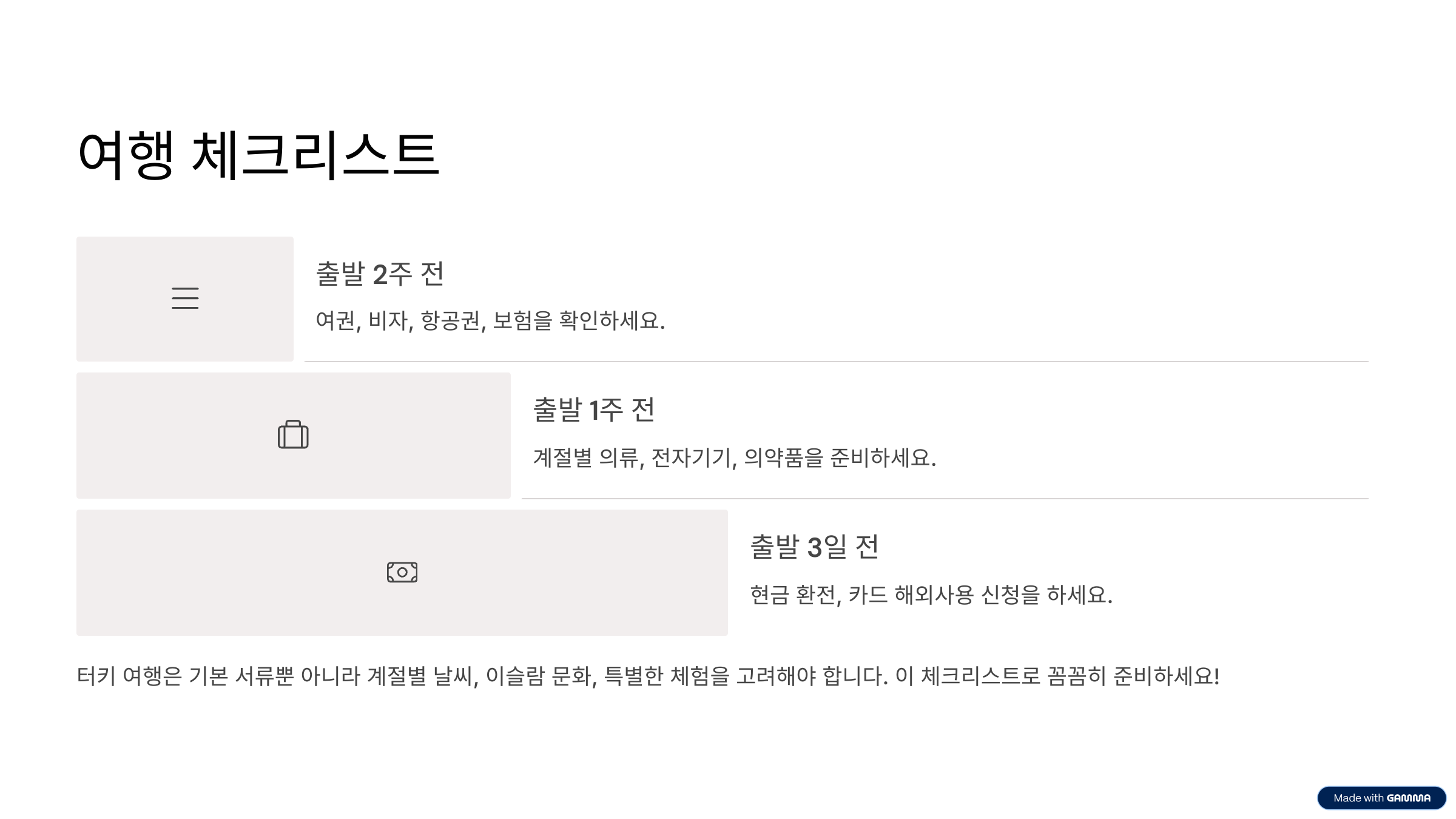 출발 전 이 체크리스트를 활용해 꼼꼼히 짐을 점검하고, 여유 있는 마음으로 터키의 매력에 흠뻑 빠져보세요!