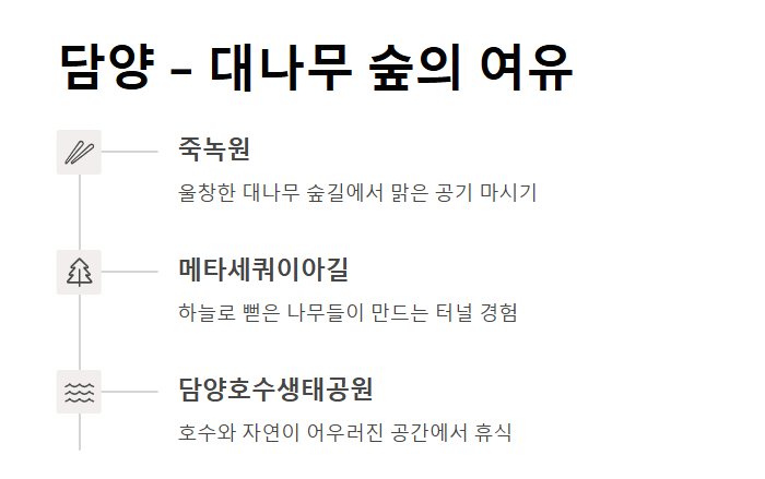 또한, 메타세쿼이아 가로수길과 담양호수생태공원도 함께 방문해보시길 추천합니다.