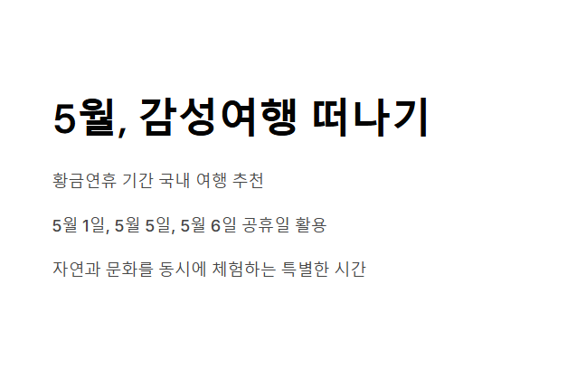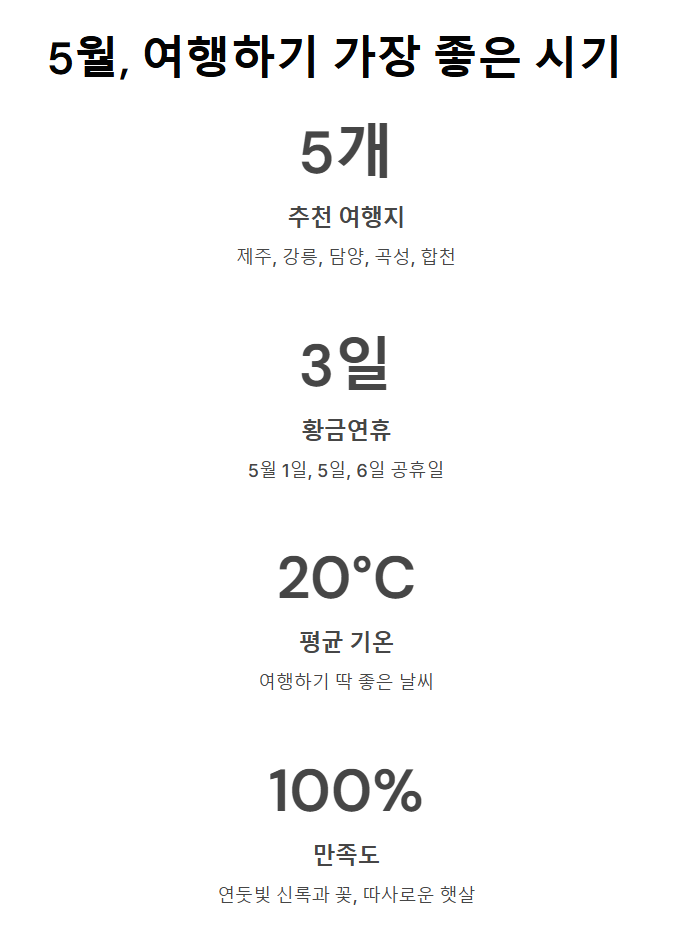 이러한 황금연휴를 활용하여 국내 여행을 계획하는 분들을 위해, 5월에 가기 좋은 국내 여행지를 추천해 드립니다.