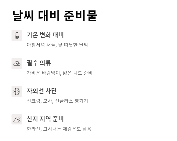 특히 한라산, 강원 산지나 내륙 고지대에서는 체감 온도가 낮을 수 있으므로 가벼운 바람막이나 얇은 니트를 챙기시는 것이 좋습니다.