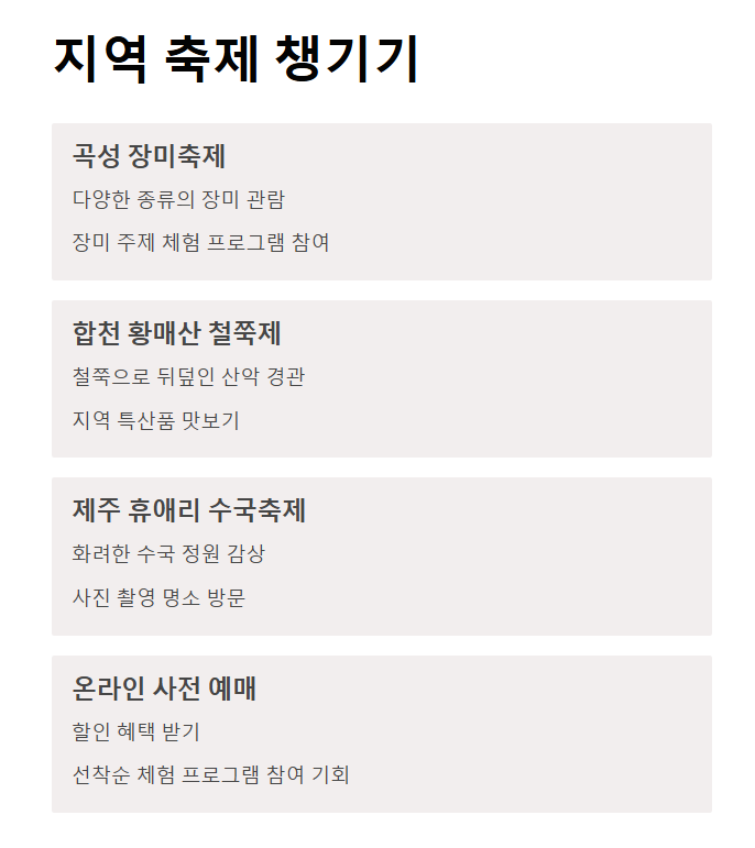 곡성 장미축제, 합천 황매산 철쭉제, 제주도 휴애리 수국축제 등 5월은 전국에서 지역 꽃축제가 집중적으로 열리는 시기입니다.