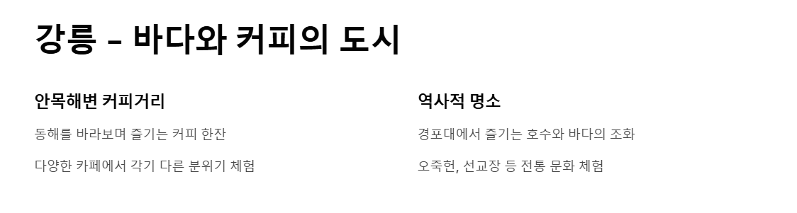 강릉은 동해안의 아름다운 해변과 함께 커피 문화로 유명한 도시입니다.