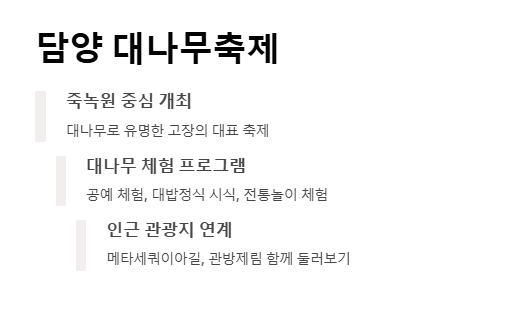 담양은 대나무로 유명한 고장으로, 대나무축제는 죽녹원을 중심으로 열립니다.